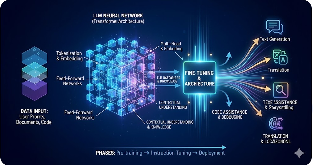 Illustration showing machine learning algorithms, neural networks, and autonomous AI system components working together to build intelligent automation solutions.