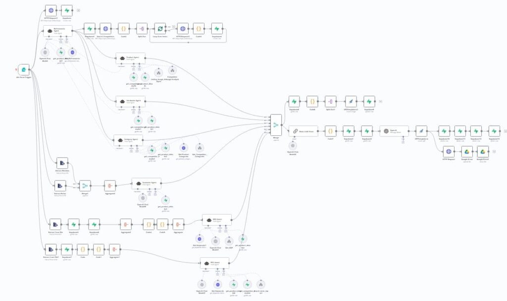 A complex n8n workflow diagram displaying an advanced AI Agent architecture, featuring LLM model integration, Vector Store RAG memory nodes, and custom tool function calling for enterprise automation.